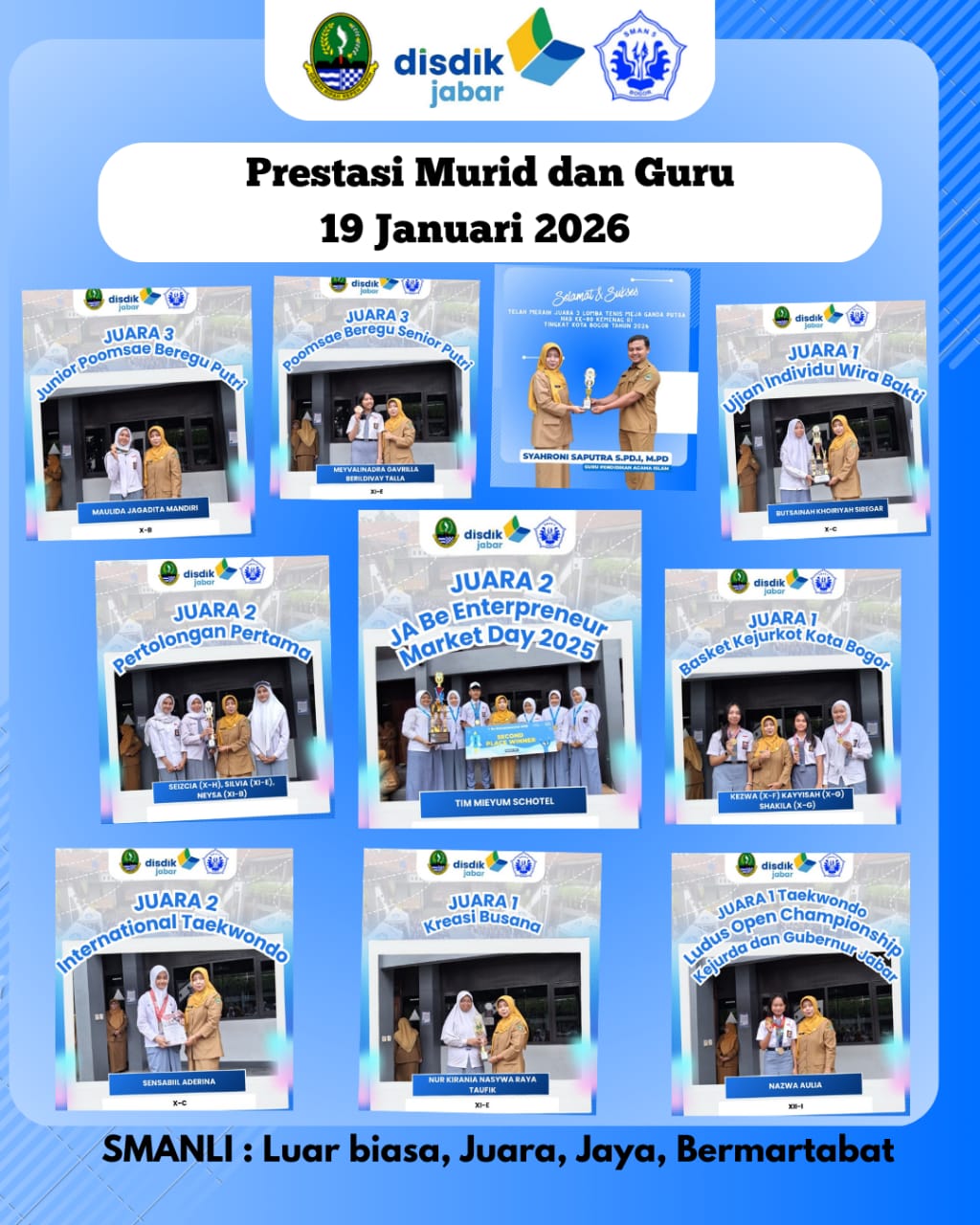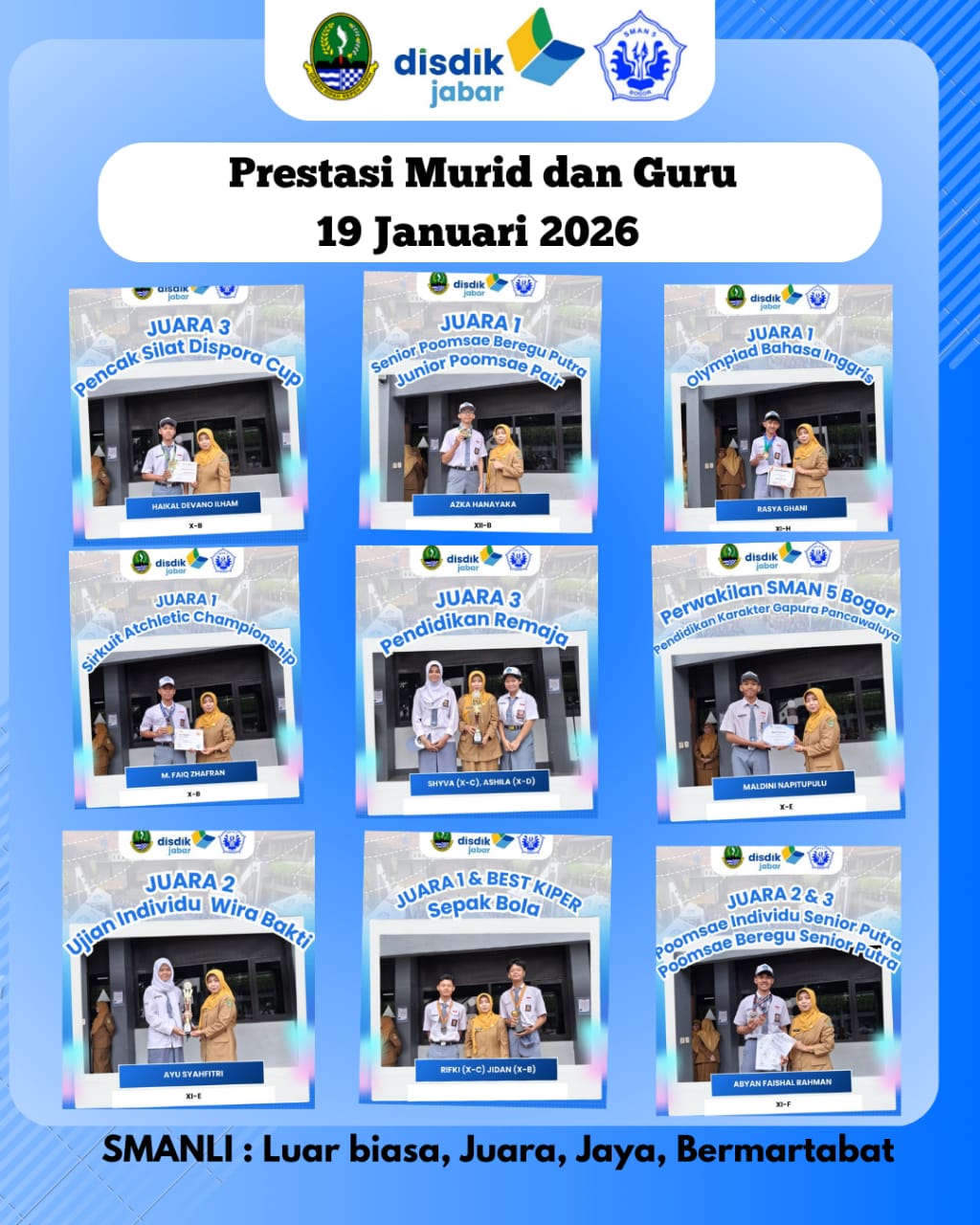 Keluarga besar SMAN 5 Bogor menyampaikan ucapan selamat dan rasa bangga atas berbagai prestasi gemilang yang telah diraih oleh para murid dan guru. Capaian ini merupakan buah dari kerja keras, ketekunan, semangat pantang menyerah, serta sinergi positif antara peserta didik, pendidik, dan seluruh warga sekolah.