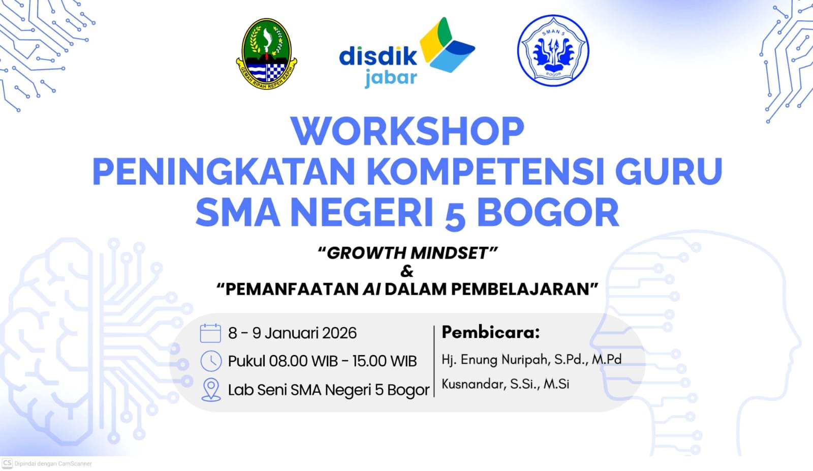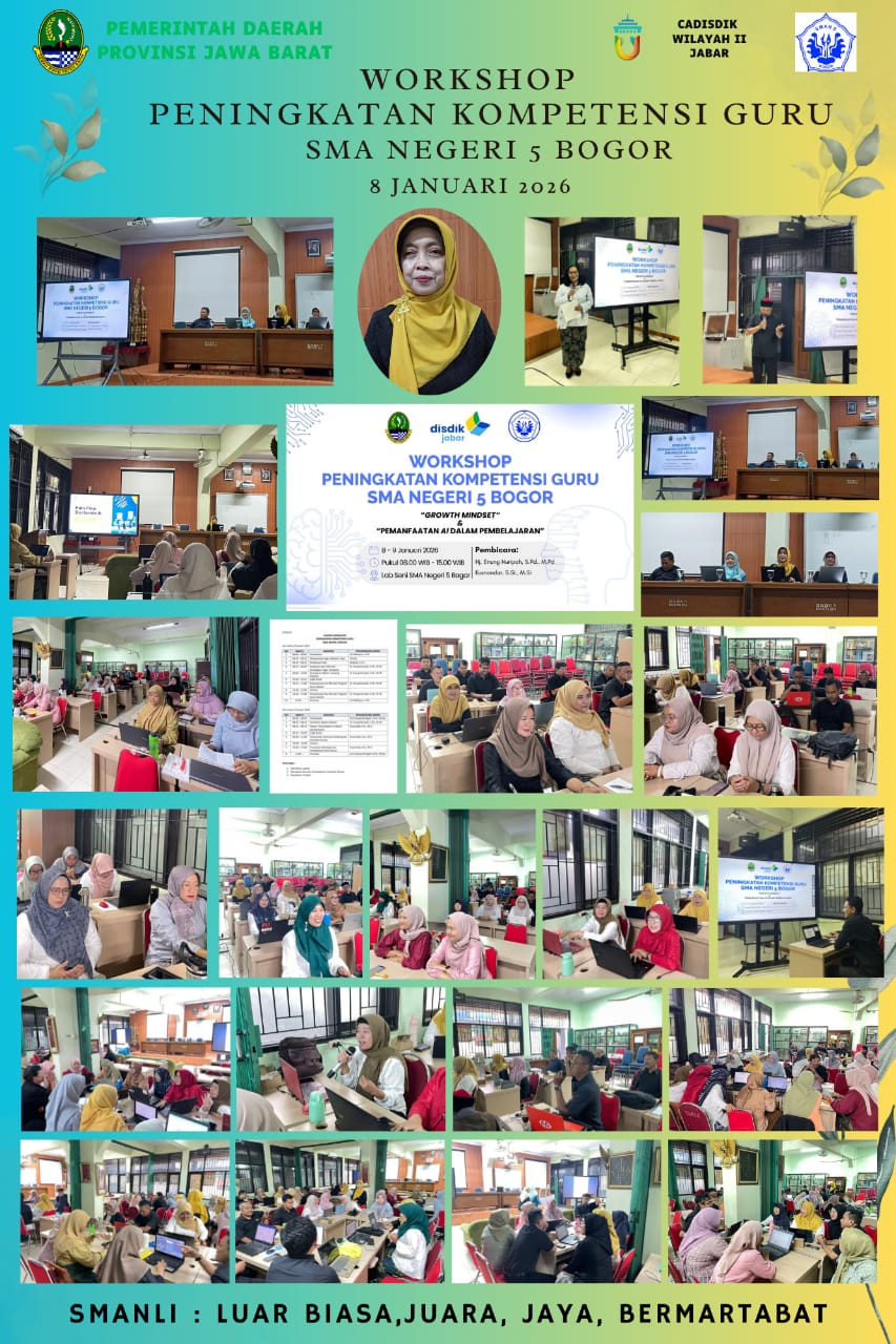 Kamis, 8 Januari 2026, telah dilaksanakan workshop peningkatan kompetensi guru SMA Negeri 5 Bogor dengan tema "Growth Mindset". Kegiatan dimulai pukul 08.00 WIB dan diikuti oleh seluruh pendidik serta tenaga kependidikan.